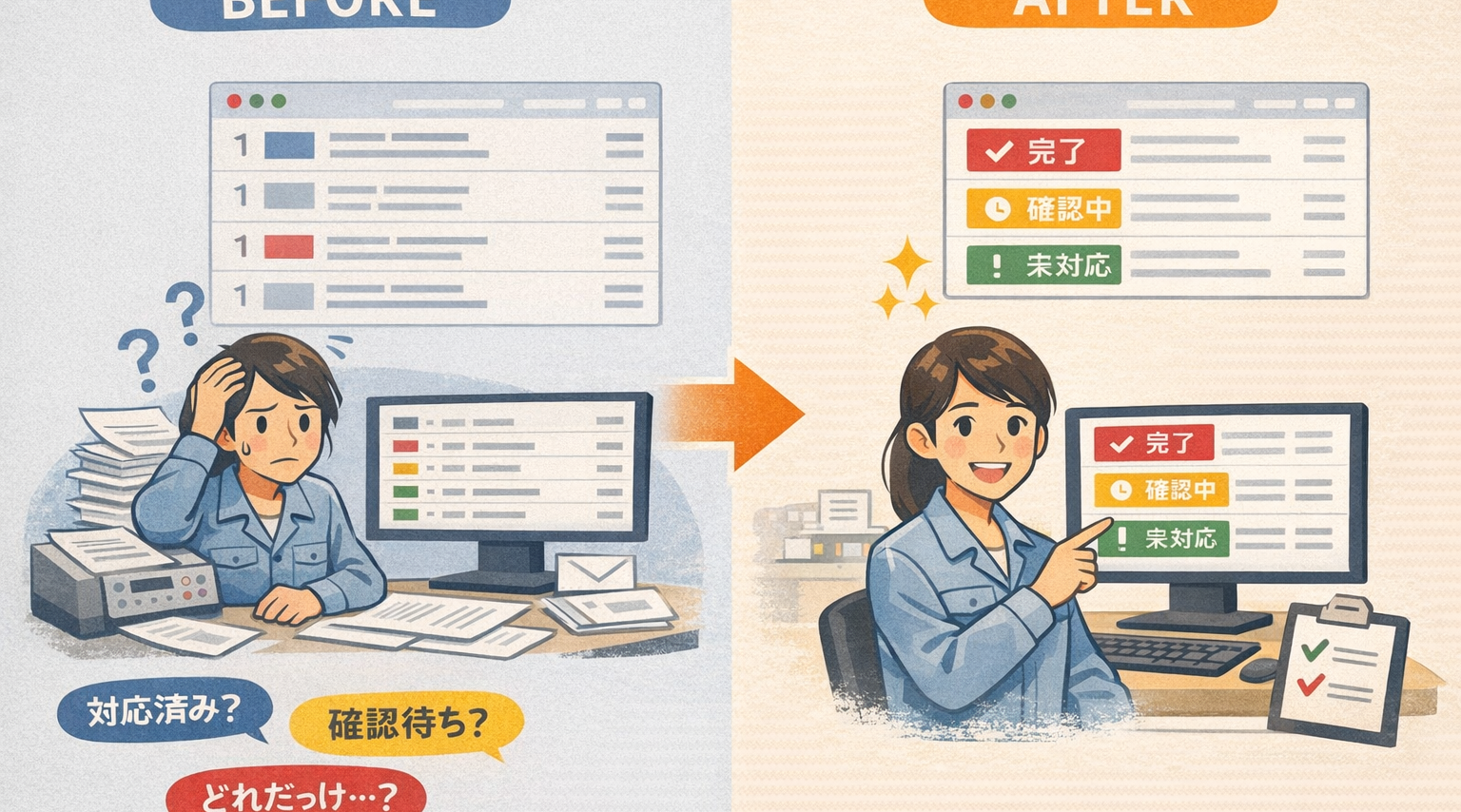 この色分けを導入したことで、対応状況が一瞬で分かる担当者が変わっても状況を共有しやすい、